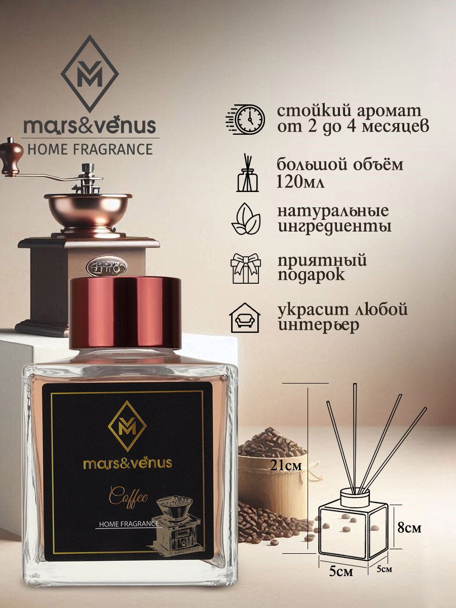 Предлагаем вам интерьерный ароматический диффузор с ротанговыми палочками Mars&Venus Coffee («Кофе»). Аромадиффузор Coffee от Mars&Venus – это волшебное путешествие в уютную кофейню, где вас окутает аромат свежесваренного кофе. Его насыщенные, бархатистые ноты пробуждают приятные воспоминания и создают атмосферу уюта и комфорта, приглашая вас расслабиться и насладиться каждым мгновением. Многогранный кофейный аромат, дополненный теплыми древесными нотами, создает неповторимую композицию, наполняющую комнату мягкой, успокаивающей аурой. Этот аромат прекрасно подойдёт тем, кто ценит уют и наслаждается каждым мгновением жизни.