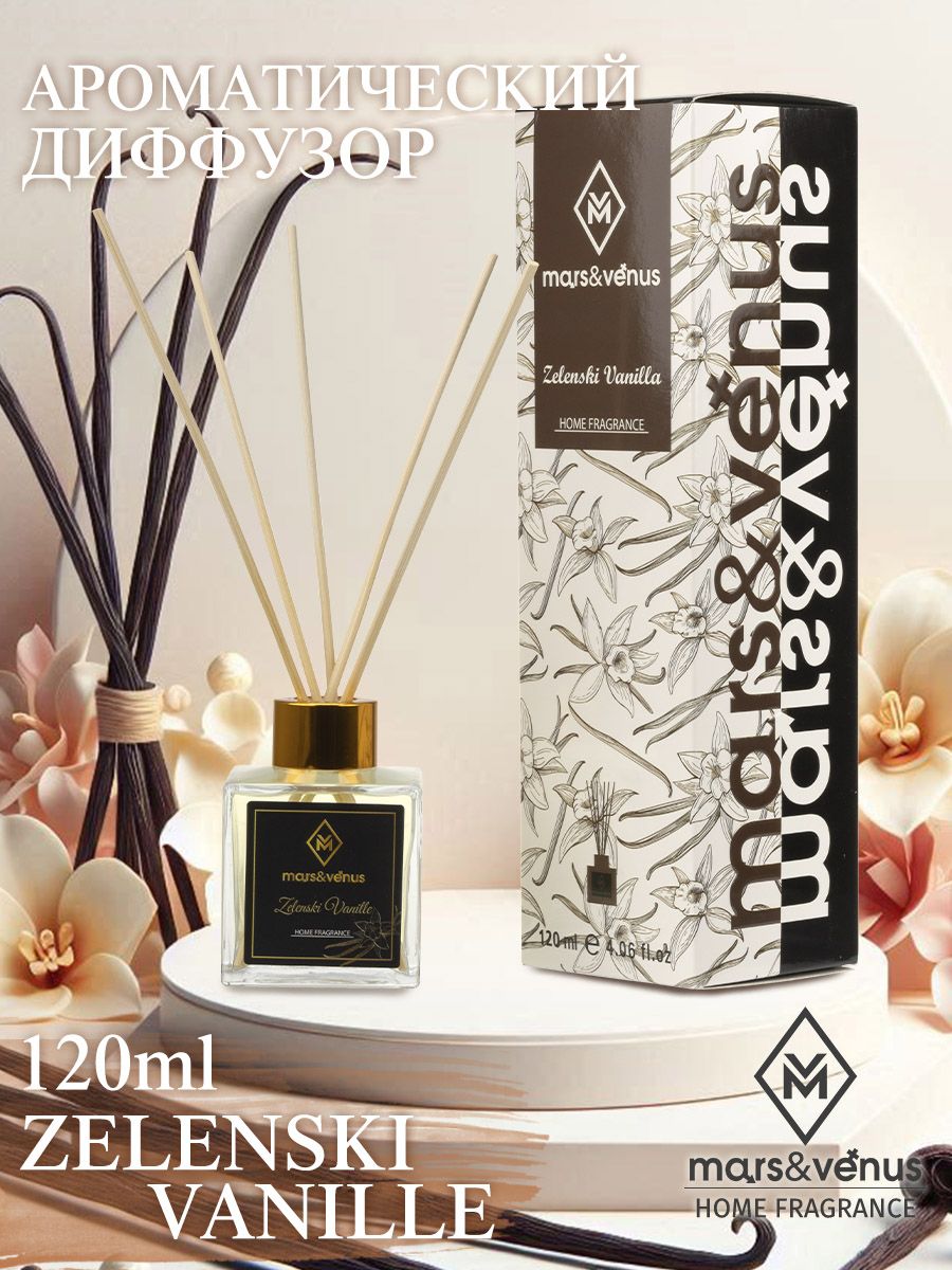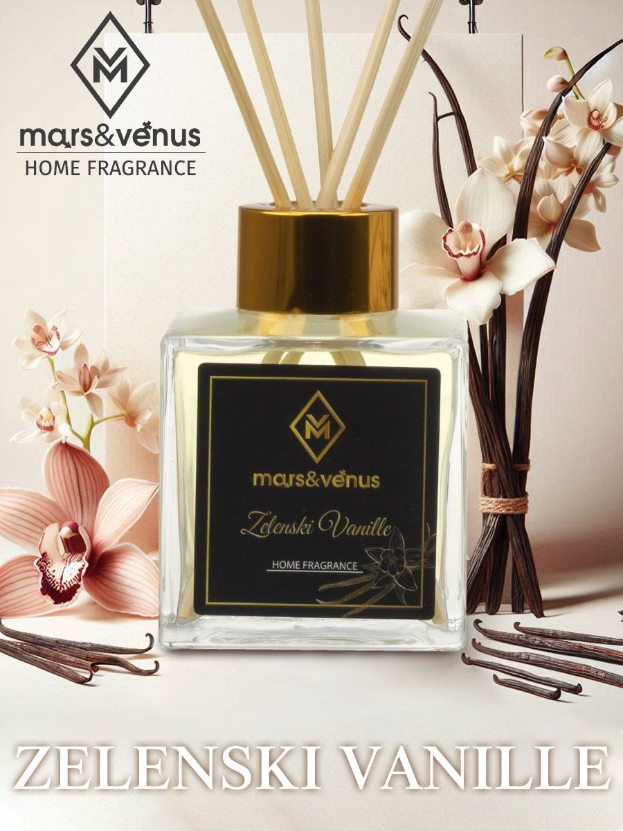 Предлагаем вам интерьерный ароматический диффузор с ротанговыми палочками Mars&Venus Zelenski Vanille («Ваниль от Зеленски»).